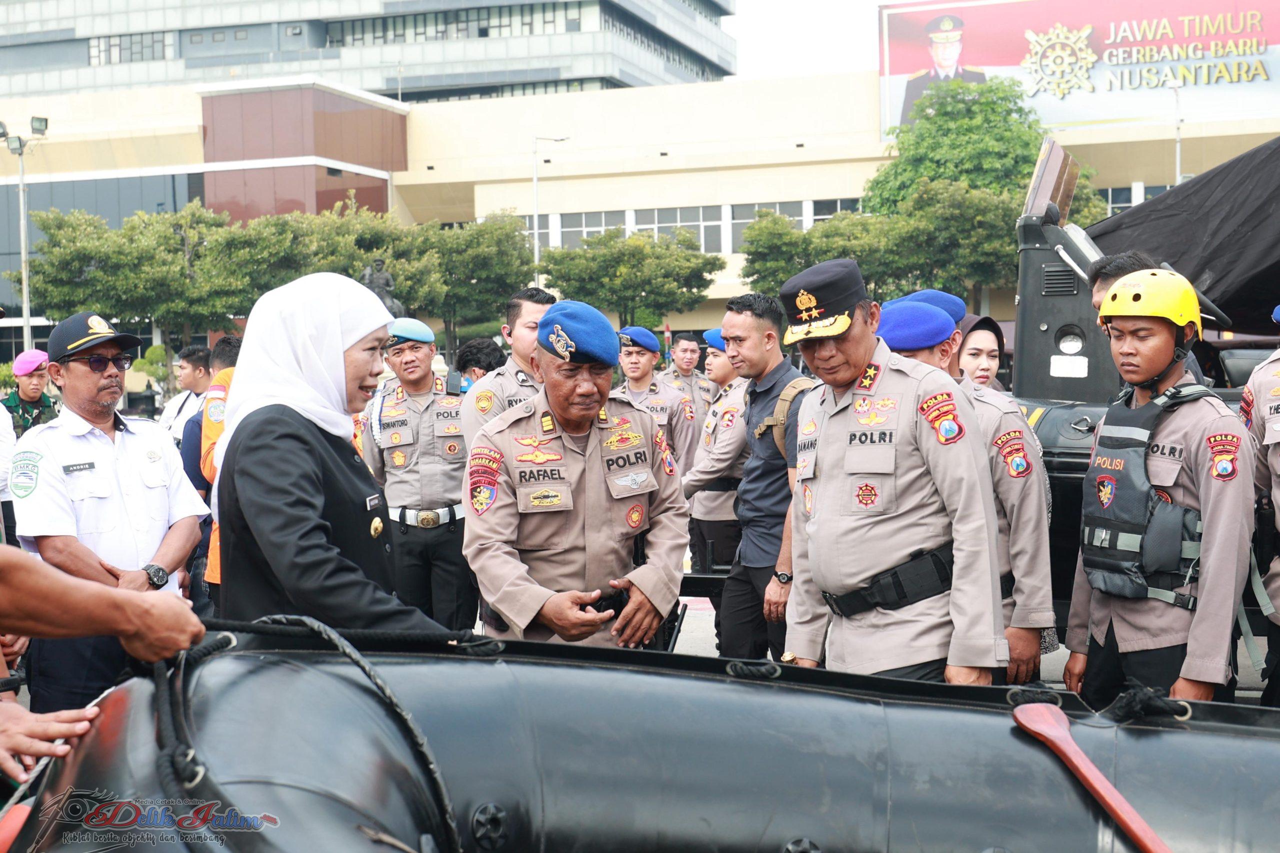SURABAYA, Delikjatim.com – Kapolda Jawa Timur Irjen Pol Drs. Nanang Avianto, M.Si., bersama Gubernur Jawa Timur Khofifah Indar Parawansa meninjau secara langsung kesiapan peralatan Search and Rescue (SAR) yang dimiliki oleh jajaran Polda Jatim, meliputi Korps Brimob, Direktorat Polairud, dan Dit Sabhara.