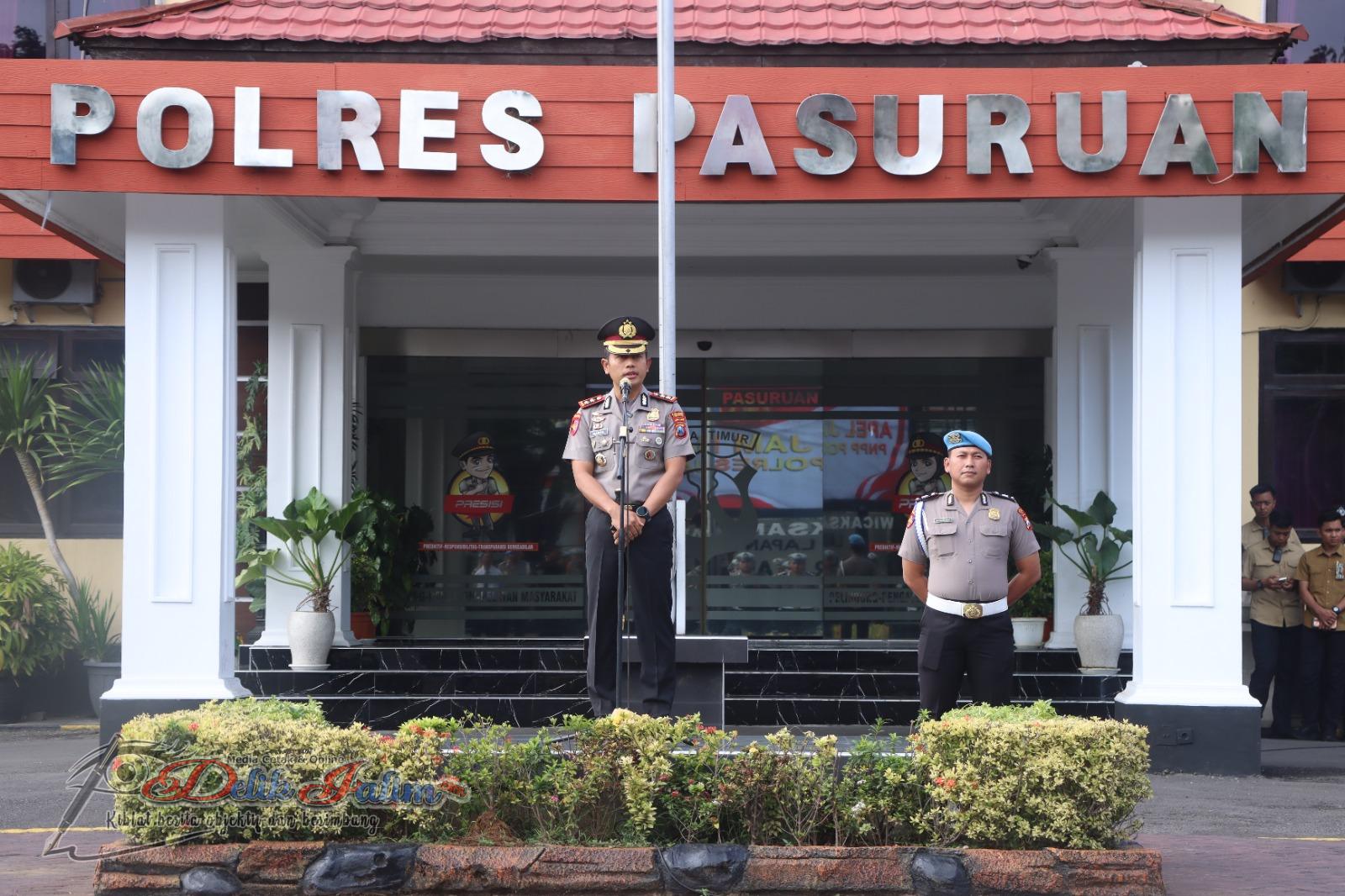 Apel yang dimulai pukul 08.00 WIB tersebut diikuti oleh Wakapolres Pasuruan Kompol Andi Purnomo, S.H., M.H., para Pejabat Utama (PJU), serta seluruh personel Polres Pasuruan.
