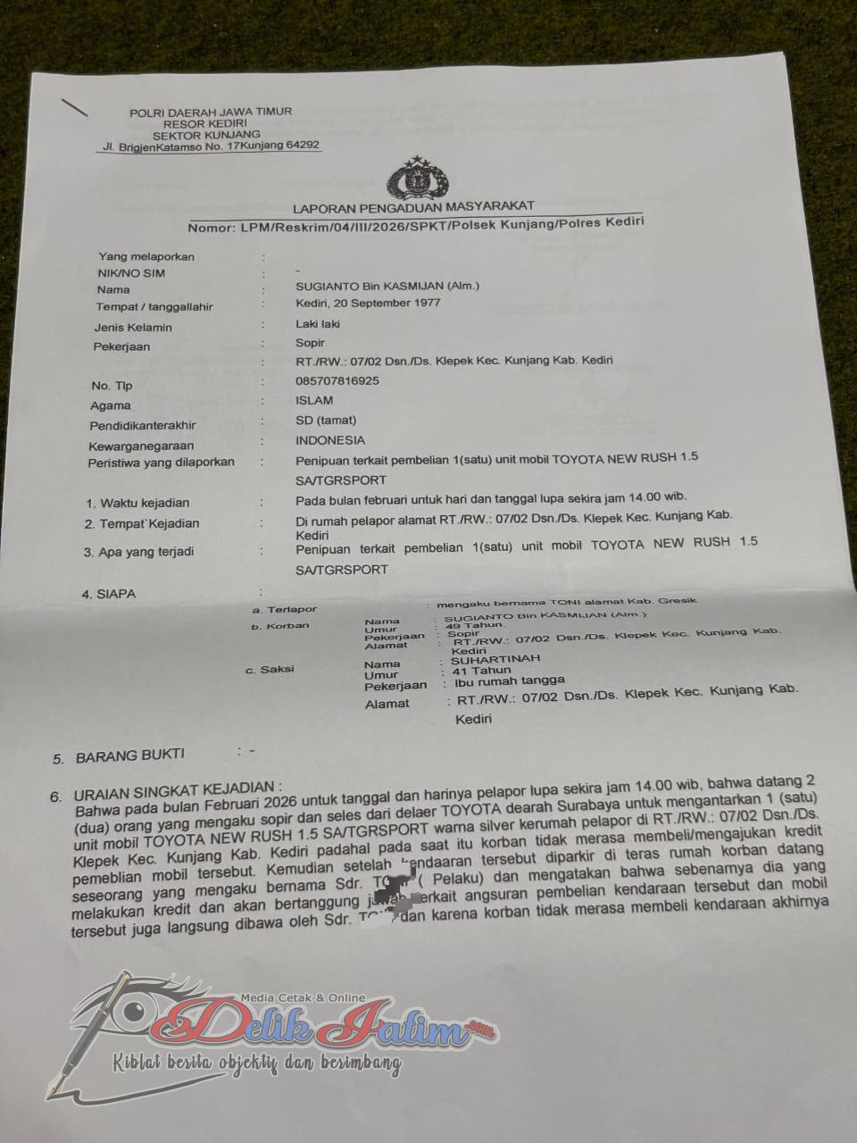 Kediri, Delikjatim.com – Kasus dugaan penipuan kredit mobil yang menimpa Sugianto, warga Kecamatan Kunjang, Kabupaten Kediri, kini resmi dilaporkan ke pihak kepolisian.