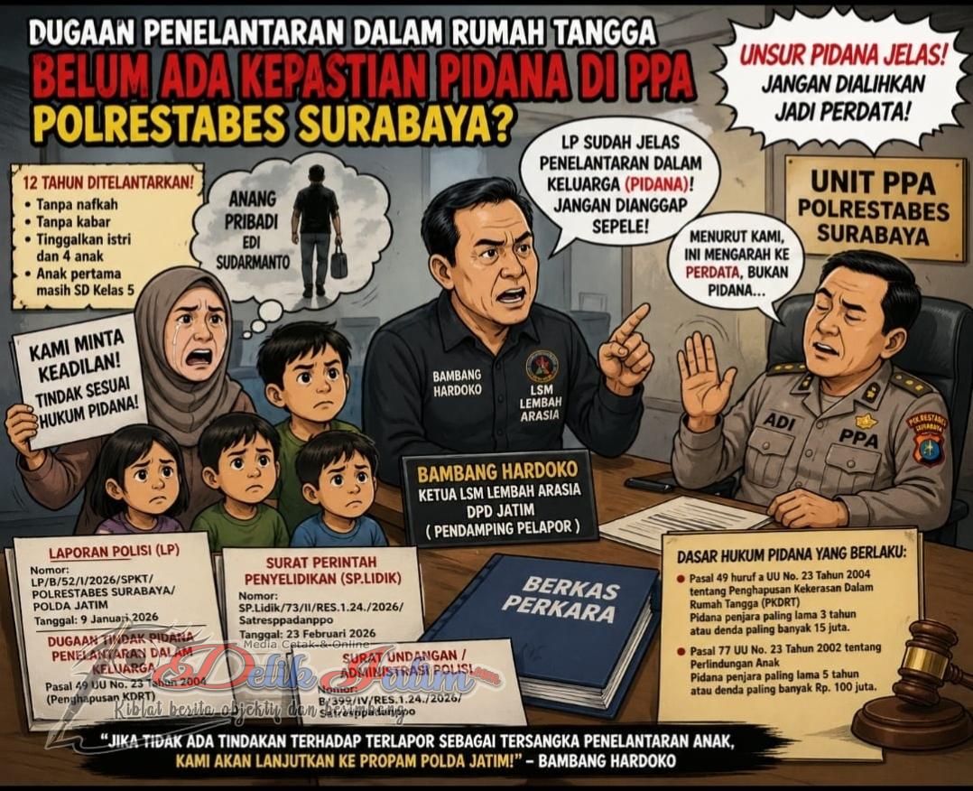 Surabaya, Delikjatim.com – Penanganan kasus dugaan penelantaran dalam rumah tangga di Unit Perlindungan Perempuan dan Anak (PPA) Polrestabes Surabaya menuai kritik tajam. Pelapor bersama pendamping dari LSM Lembah Arasia menyatakan ketidakpuasan atas belum adanya kepastian hukum pidana, meski laporan resmi kepolisian telah diterbitkan dan proses penyelidikan berjalan.
