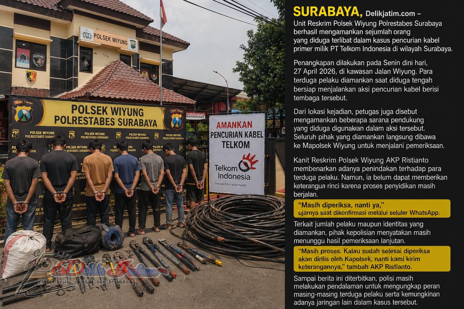 SURABAYA, Delikjatim.com – Unit Reskrim Polsek Wiyung Polrestabes Surabaya berhasil mengamankan sejumlah orang yang diduga terlibat dalam kasus pencurian kabel primer milik PT Telkom Indonesia di wilayah Surabaya.