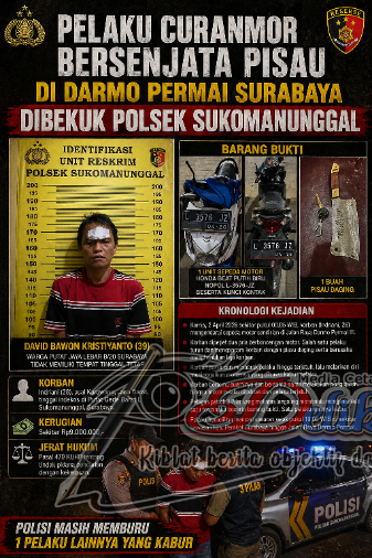 Surabaya, Delikjatim.com – Unit Reskrim Polsek Sukomanunggal Polrestabes Surabaya berhasil meringkus seorang pelaku pencurian sepeda motor dengan kekerasan yang terjadi di Jalan Raya Darmo Permai III Surabaya, Kamis (2/4/2026) sekitar pukul 00.05 WIB.